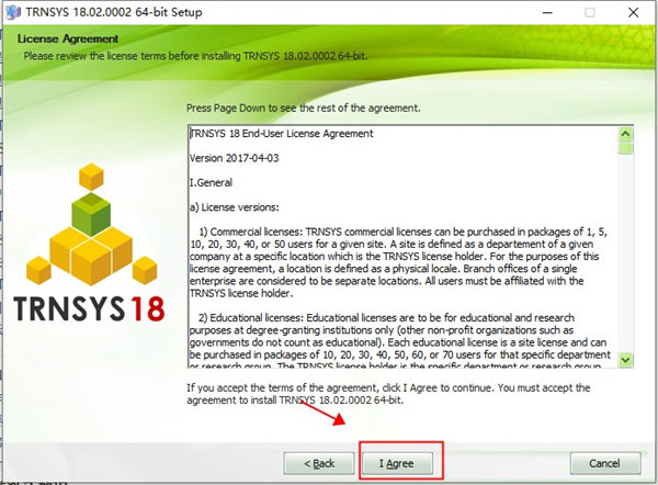 2、双击运行"trnsys_18.02.0002_64bit_setup.exe"程序,点击i agree接受安装协议;