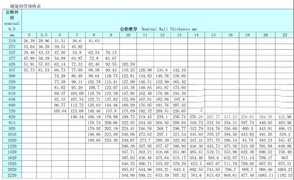 小编这里为广大网友分享的是一份螺旋钢管规格表,它详细的罗列出了不同型号的螺旋钢管规格,适用于建筑工程人员使用。螺旋钢管广泛应用于天然气、石油、化工、电力、热力、给排水、蒸汽供热、水电站用压力钢管、火力发电、水源等长距离输送管线及打桩、疏浚、桥梁、钢结构等工程领域。