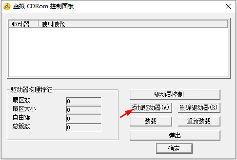 2、点击“添加驱动器”可以增加一个虚拟光驱,然后通过点击“装载”