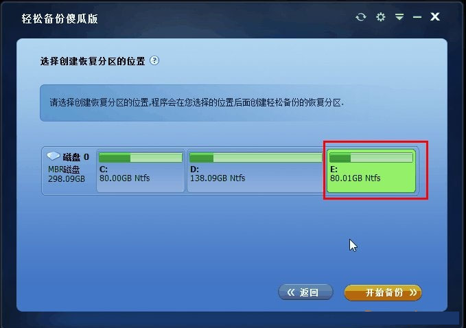 3、选中一个分区作为恢复分区的位置,点击“开始备份”。