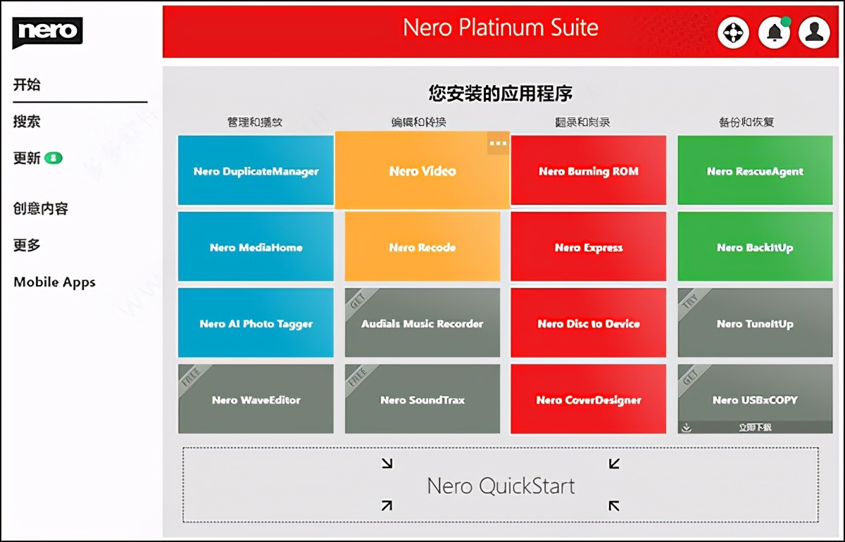 1、经过改进的交互式启动区域,可快速访问Nero Platinum Suite功能