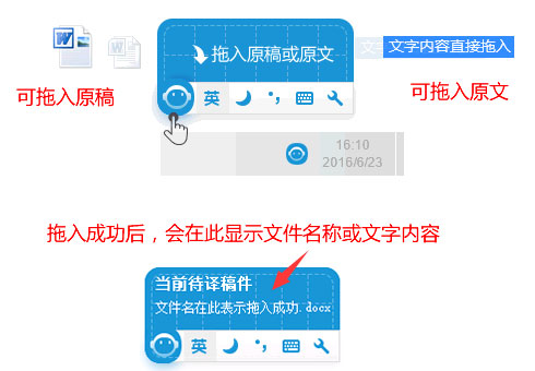 第二步:将需要翻译的中文原稿、或原文拖入右下角的轻敲输入法内。拖入原稿的目的是让轻敲智能分析,以便在接下来录入译文单词时提供精准的单词补全提示。