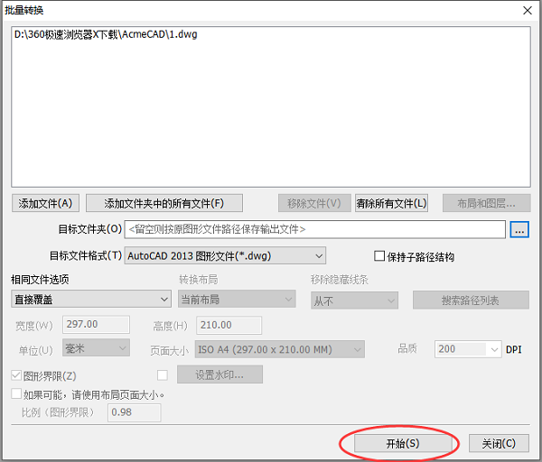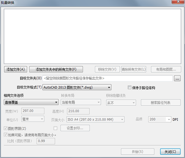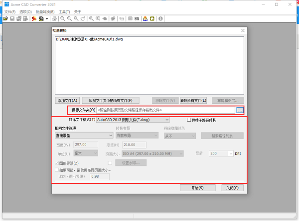6、紧接着,我们选择相应的目标文件夹、同名文件处理、转换布局、打印笔宽等参数进行设置;