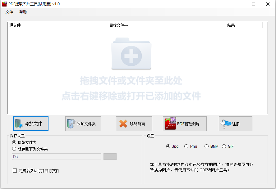 PDF提取图片工具官方版是一款非常简单且实用的PDF提取图片软件,提供了添加文件、添加文件夹、移除所有和pdf提取图片四大模块,用户能够轻松地处理各种PDF文件,同时,软件还允许用户将需要处理的PDF文件添加到工具中,用户只需选择要添加的文件,然后点击添加按钮即可。