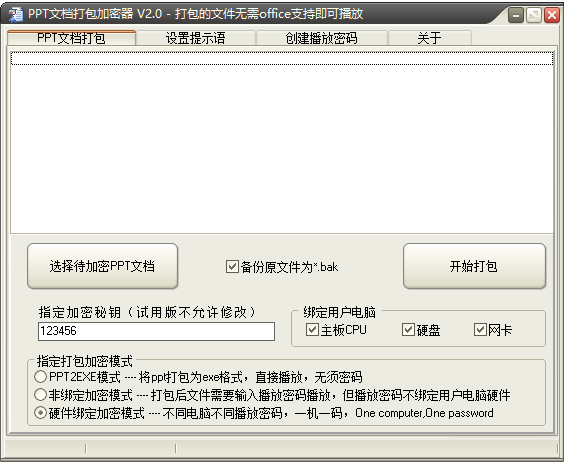 PPT文档打包加密器官方版是一款功能强大的PPT文件打包及加密工具,它能保护您的ppt文档不会被非法传播、禁止非授权编辑和播放。重要文件打包加密后,用户无法提取ppt文档中的文字和图片。