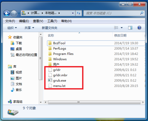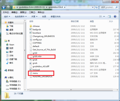 1、解压并复制目录中的menu.lst、grldr.mbr还有chinese文件夹中的grub.exe、grldr到系统盘,