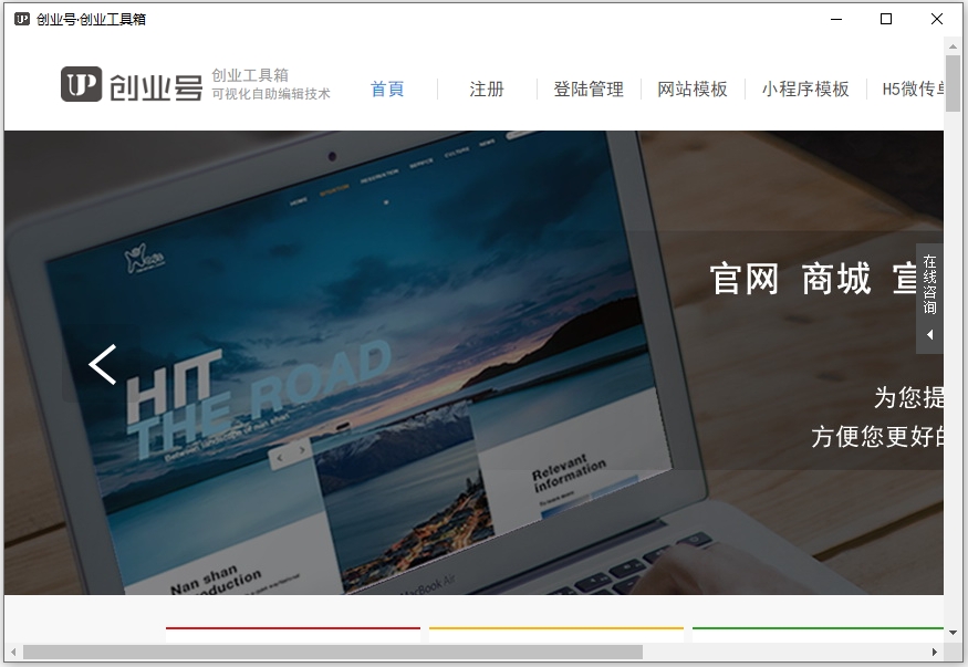创业工具箱是由创业号官方打造的一款主打一站式自助建站的多功能建站工具,软件采用强大的可视化的自动边际技术,帮助用户来创建自己的互联网宣传产品,同时对于创业者而言,一个精美的官方网站可以让用户更具安全感,对品牌的认知感也更加强烈。可适用于做企业、产品、个人、网店、手机微信等官网,内置超多丰富功能组件,更有营销应用拓展,即使没有技术基础也能够很快搞定,模板漂亮,修改简单,轻松几步搞定,有需要的可以下载体验。
