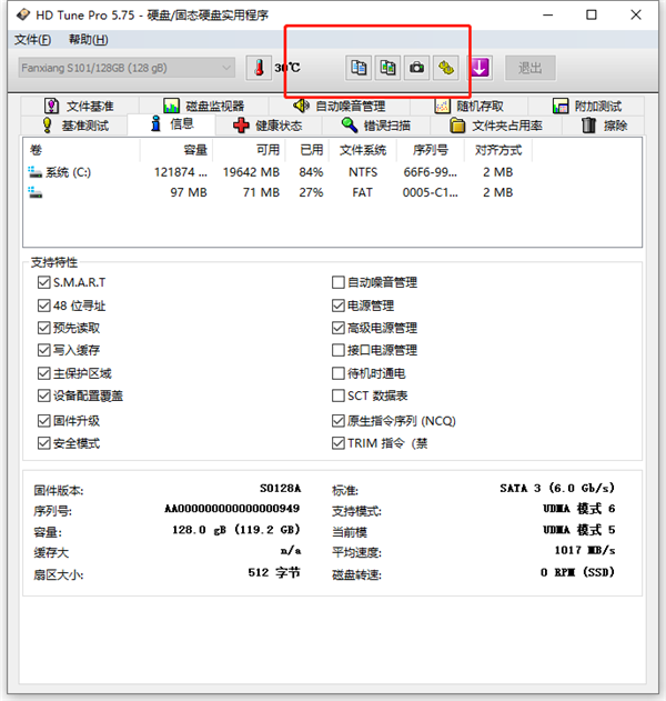5、在HD Tune软件的顶部有复制测试结果工具,还有为文软件拍照的工具,HD Tune选项也是在这个位置。