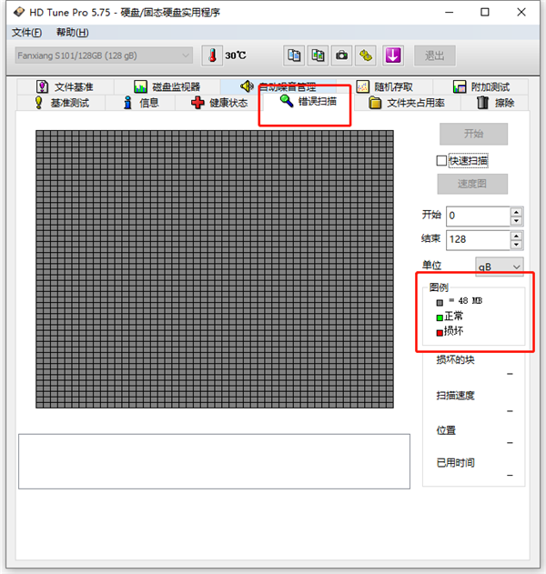2、错误扫描就是扫硬盘有没有坏道,如果硬盘上有坏道会导致系统卡顿死机这一类的现象。如果有在HD Tune表现就是显示示红色的小方块。正常会显示示绿色的方块。
