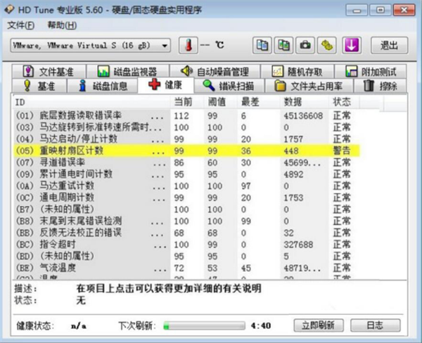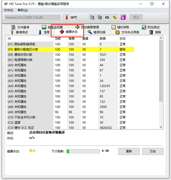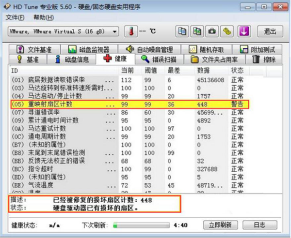 4、接下来,我们再切换至 hd tune pro 的"健康"选项卡,可以看到硬盘有些参数出现了警告,说明存在坏道。