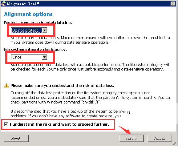 3、以下界面是对齐选项(Alignment options),Protect from an accidental data loss(数据丢失保护)有Do not protect、Reset、Powerloss三个选择,我们选择Do not protect,File system integrity check policy(文件系统完整检测)有Always(总是)、Once、Never(从不)三个选项,我们选择Once,选中左下角的复选框,点“Next>”按钮。