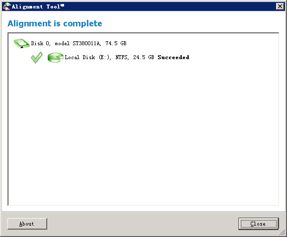 6、操作成功后会弹出下图的窗口,可以看到,分区的图标已经变成了绿色,而后面有一个Succeeded成功的标识,现在E盘的4K就对齐了。