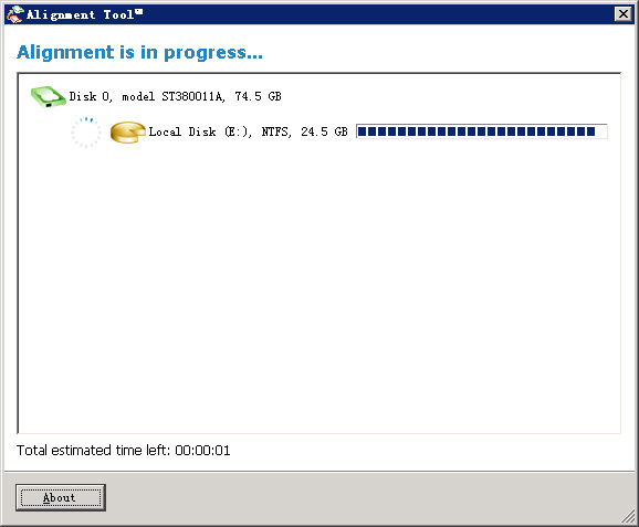5、“Alignment is in Progress…”正在执行操作,这个过程视你的分区大小以及使用量而定,文件越少,对齐的越快,小编对齐了25G多,使用量为2G的分区大概用了近2-3分钟左右。在这个过程中,电脑不要断电,对齐程序不要强制停止,否则可能会导致硬盘损坏!