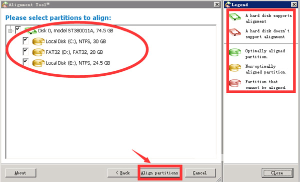 4、以下界面左侧是你的硬盘分区信息,右侧是说明,如果显示绿色,则是已经对齐4K,而显示黄色,则是可以对齐4K,但未对齐,而粉红色的,则是不支持高级格式化,也就是对齐4K也没用。我们选择黄色未对齐分区(小编这里是选择的E盘),勾选上,然后点下面的“Align Partitons”按钮。