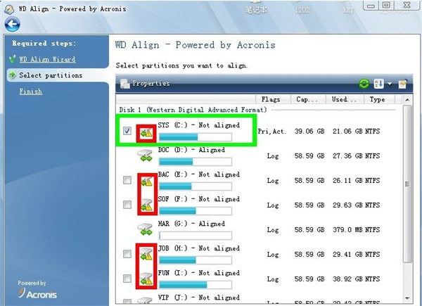 3、WD Align会自动检测本机硬盘的对齐状况,如果您的硬盘分区存在4K/扇区未对齐情形,则在相应的分区图片上出现黄色叹号,此时您可以在勾选相应的分区进行对齐操作。(不需要对齐的分区,则无勾选框出现)。勾选完毕后,点击“Next”进行下一步操作。