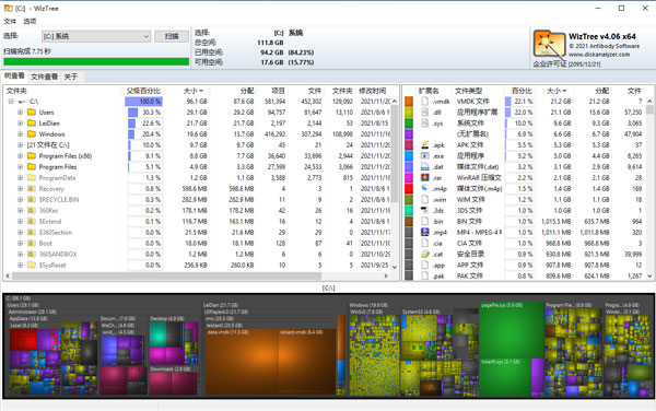 wiztree是一个非常实用的硬盘清理工具,可以轻松扫描硬盘驱动器并显示哪些文件和文件夹使用了多少的磁盘空间,并且以可视化方式显示,从而让用户可以轻松查找电脑中的大文件。同时由于软件采用了直接从磁盘读取硬盘驱动器的主文件表,可以绕过操作系统,对电脑进行快速扫描,能够支持扫描非 NTFS 硬盘驱动器、网络驱动器、USB 驱动器和单个目录,真正轻松找出并删除无用的大型文件和文件夹。另外全新的wiztree对于个人用户完全免费,而专业版需要付费,但功能更为强大,支持文件名搜索(通过名称或通配符匹配快速查找文件)、支持命令行调用、以及导出文件大小占用的分析结果列表 (.csv 格式),还可以通过文件“大小”和“分配”两个属性来分辨出文件是否真正有在占用空间,没有实际下载的文件,其“分配”空间会显示 0,是你找出大型文件删除清理神器。ps:这次小编给大家带来的是wiztree中文破解版,内置了破解文件,可以轻松解锁所有高级功能,有需要的小伙伴快来下载体验吧。