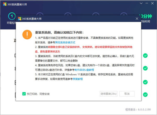 重装有风险,装机需谨慎。重装大师为您智能备份系统,如果您对所安装的新系统不满意,7天内再次使用360系统重装大师就可以恢复之前所安装的系统。不需要您手动备份!没有后顾之忧!