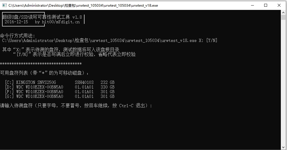 3、待测盘符只能是字母,不要冒号,按Ctrl-C随时中止退出