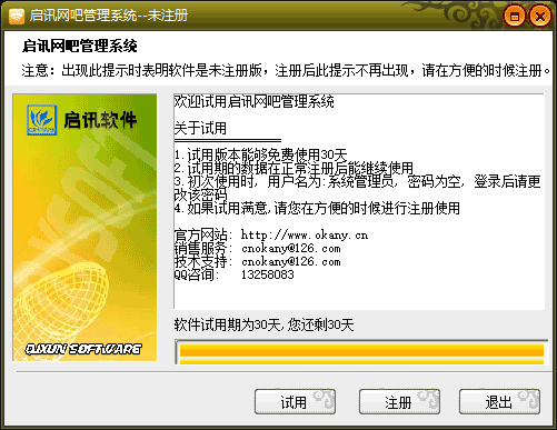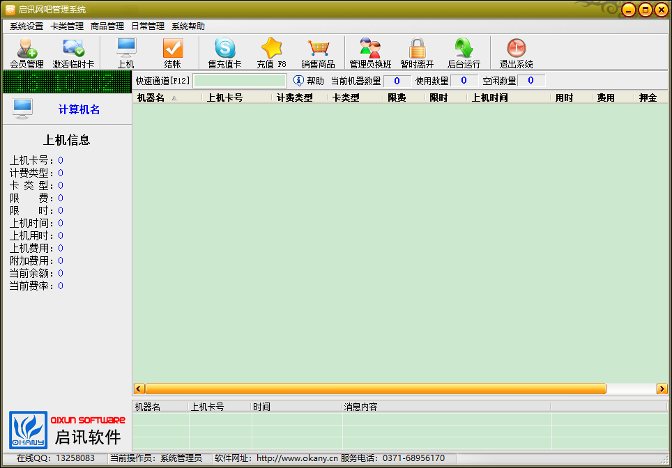 启讯网吧管理系统是由郑州启讯软件推出的一款功能完善,方便实用的网吧管理系统。它集合了多款网吧、机房计费管理系统的精华,具有有灵活多样的费率设置、强大的会员管理、普通用户管理、商品管理、远程操作、上机记录以及加钱记录功能,是大中小型网吧、学校机房、电子图书馆的计算机管理计费的理想选择。