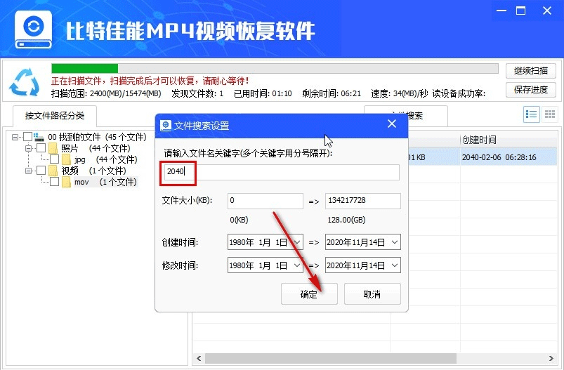 4、输入想要恢复的文件关键词,点击确定按钮之后即可开始搜索;