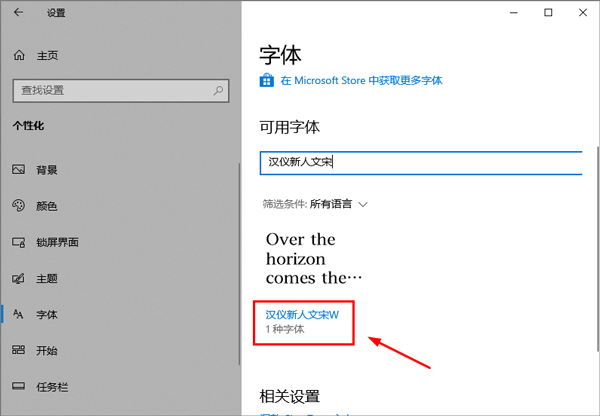 3、安装完成后,打开控制面板,搜索字体设置,然后搜索汉仪新人文宋w字体即可使用。