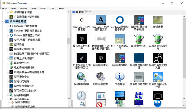 5、在桌面与任务栏上,可以快速设置包括微软小娜、任务栏大小、搜索框位置以及禁用动态磁贴、禁用快速操作按钮等;