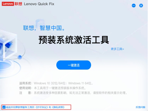 注意:本工具不适用于预装Win7系统的电脑和出厂未预装操作系统的机型;不能用于激活非联想预装的其它版本操作系统。