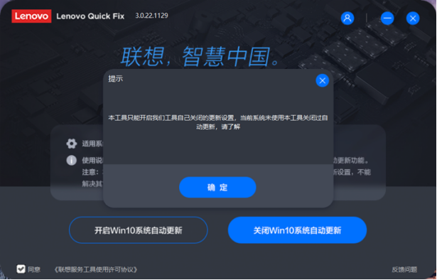 注意:本工具只可开启由该工具关闭的系统更新设置,否则操作时工具会给出提醒信息,不可执行开启操作。