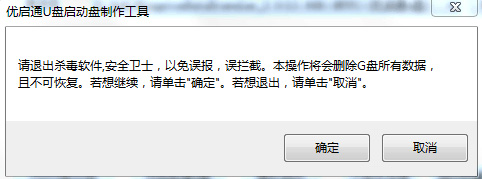 第二步:弹出警告窗口告知会删除U盘所有数据,请先确认是否备份好U盘数据,确认完成后即可点击“确定”: