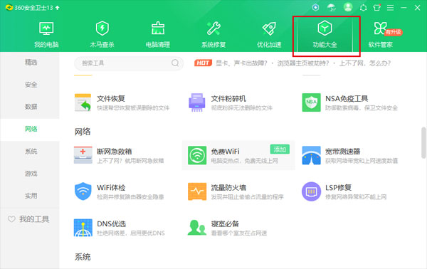 1、首先在电脑中打开360安全卫士,然后找到的“功能大全”,如下图所示。