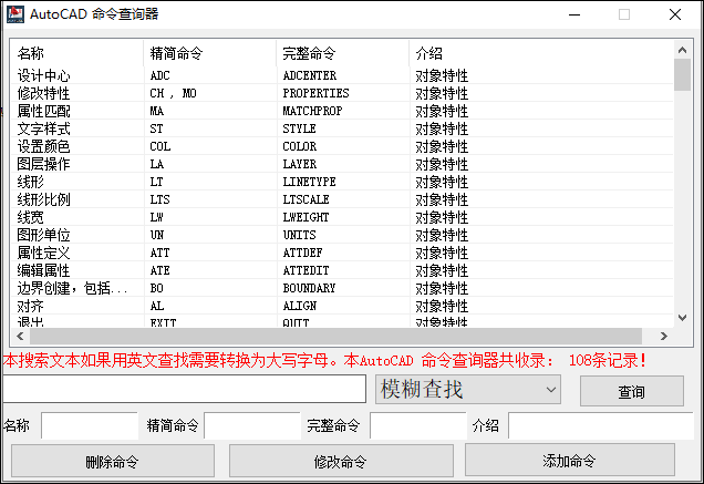 用户在使用AutoCAD的时候,运用最多的就是命令操作了,学会之后可以轻松提高绘图效率,但很多初学者对有些命令可能不太熟悉。为此小编给大家带来了AutoCAD命令查询器,这是一款简单实用的AutoCAD命令大全查询小工具,通过它可以帮助用户轻松查询各种绘图命令,并为CAD绘图提供帮助。