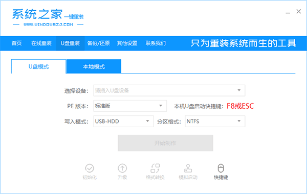 4、将U盘插到电脑上,点击“U盘重装”,选择好写入模式和分区格式,点击“开始制作”即可重装,如果没有U盘,还有选择本地模式可以选择哦。