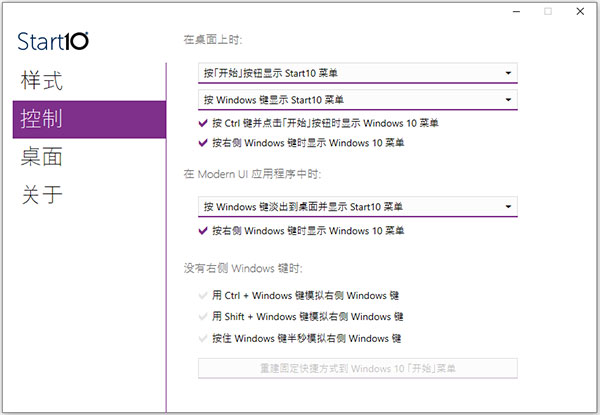 2、控制方案,您可以设置一个快捷键切换不同的电脑系统效果,默认按住“开始”按钮显示Start8菜单;
