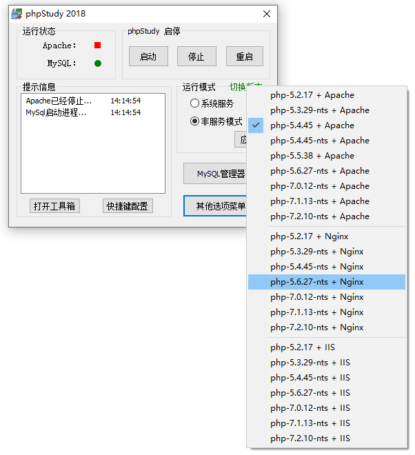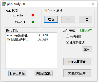 目前phpstudy 2018支持Apache/Nginx/Tengine/Lighttpd/IIS7/8/6,有专门的控制面板,对学习PHP的新手来说,WINDOWS下环境配置是一件很困难的事,而只需下载这款phpstudy2018只需安装一次,就无须配置其他的东西即可使用,是非常方便、好用的PHP调试环境,不管你是新手还是老手都是非常推荐大家使用的。注意:打开localhost或站点出现404错误时,可以尝试自检服务(点击自检->点击“应用”按钮)。
