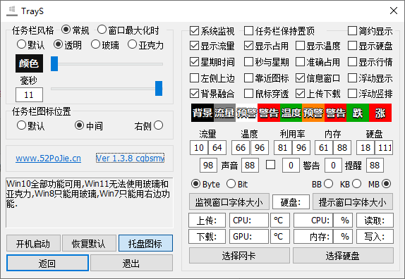 最近我发现了一款挺不错的Windows 10任务栏透明化工具——Trays。说实话,一开始我以为这只是个简单的美化软件,结果发现它的功能还挺强大的。它不仅可以调整任务栏的颜色、样式和透明度,还能实时监测电脑的硬件状态,比如流量、温度和CPU使用情况,这对喜欢折腾系统的玩家来说真的太方便了。