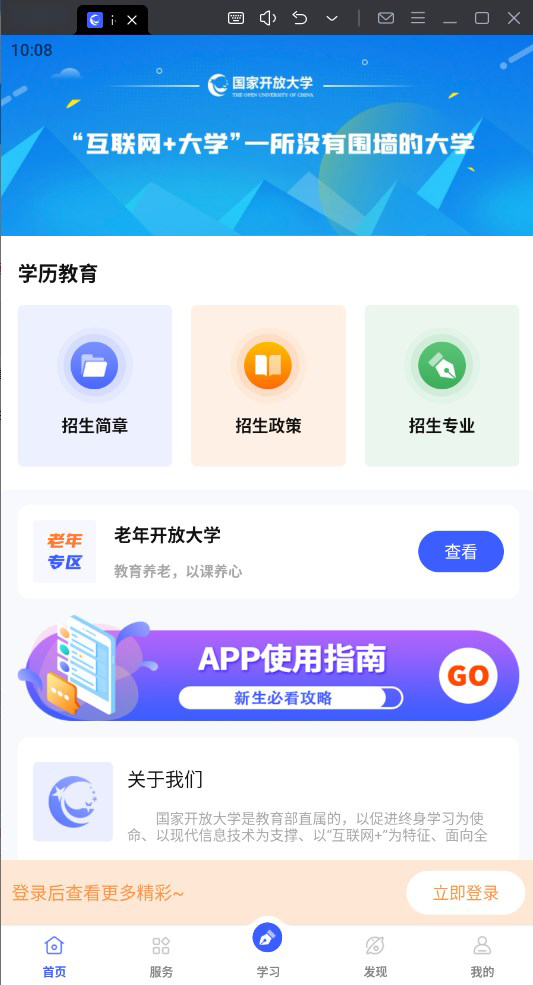 i国开电脑版是一款基于安卓模拟器运行的学习教育软件,以促进终身学习为使命,为现代信息技术为支撑,以“互联网+”为特征,面向全国开展开放教育的新型高等学校,面向全民提供终身教育以及服务,促进“人人皆学、处处能学、时时可学”。