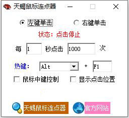 天蝎鼠标连点器是一款绿色免费,功能实用的鼠标连点辅助工具,它可以全自动大量代替人工点击鼠标左键或右键,可以帮你减少了操作时间也提高了效率。软件操作非常简单,只要按下热键,让天蝎鼠标连点器帮你点击即可,无任何插件,纯净绿色,仅1个文件,体积小巧,能突破所有游戏和软件对鼠标点击的屏蔽有效作用于CF游戏、网络聊天室、梦三国、和各种页游让用户玩游戏方便快捷,有需求的用户不妨下载体验!