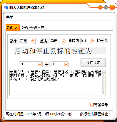 我用过不少类似的连点器,但这款真的让我眼前一亮。不仅操作流畅,而且更新日志里还增加了背景音乐和作者联系方式这些贴心的小细节,感觉开发者真的很用心。如果你需要一款好用的鼠标连点工具,不妨试试喵大人鼠标连点器,绝对不会让你失望!