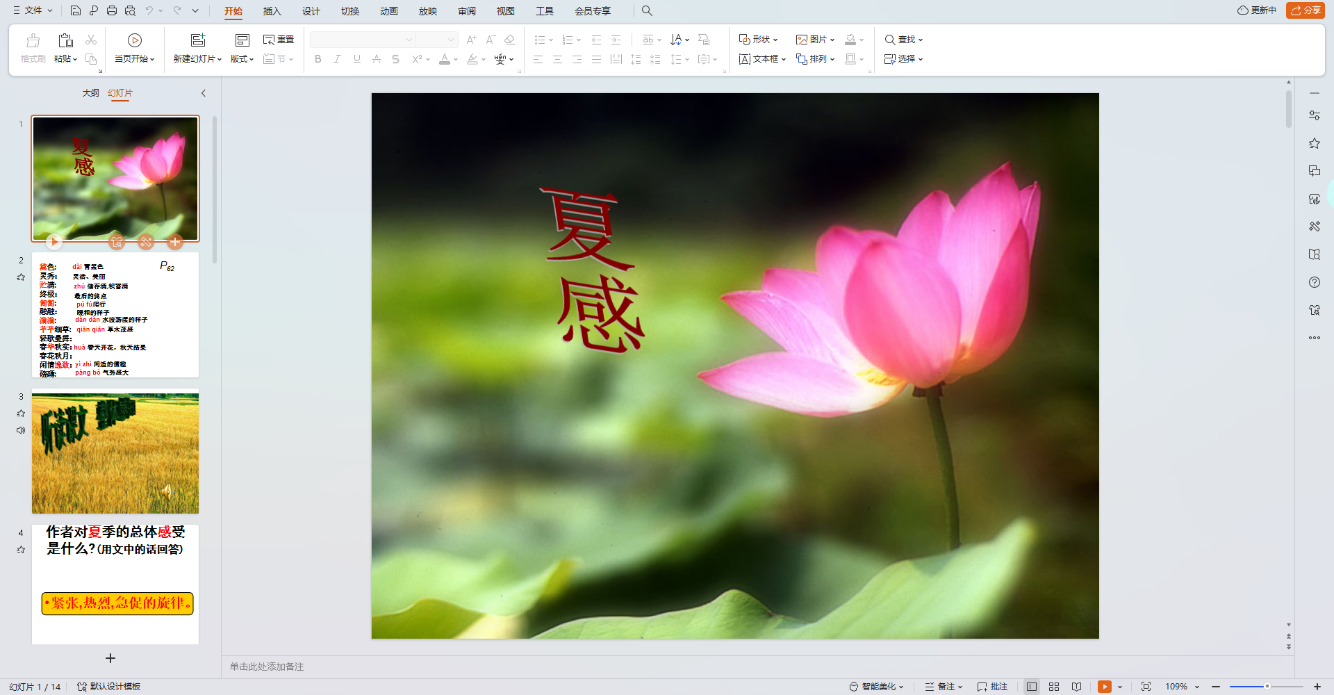 课件方面,这款PPT虽然只有14页,但内容丰富,涵盖了《夏感》的核心思想,包括作者对夏天的热爱与赞美。它不仅适合老师备课,也能帮助学生更好地理解文章主题,非常适合用来学习和教学。