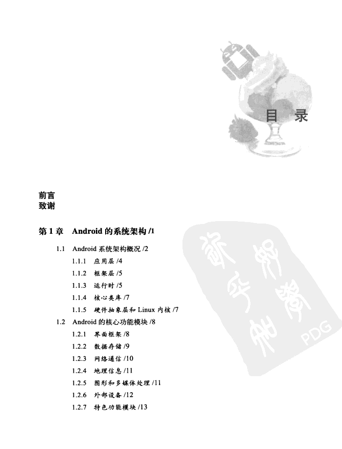 《Android开发精要》共13章,在逻辑上分为4个部分。第一部分(1-2章):第1章系统介绍了Android的系统架构、核心模块和设计思想,旨在让读者真正理解它的设计理念;第2章讲解了Android源代码的获取、编译、阅读和编辑的方法。第二部分(3-6章):第3章深入阐述了Android组件机制的设计理念和重要特征,并详细介绍了4大组件的方法和原理;第4章讲解了Intent对象和Android的意图机制,阐明了Android是如何将来自不同应用、不同进程的组件整合在一起的;第5章解析了Android中各个组件的生命周期,包括组件的进程模型和线程模型;第6章从开发的角度详细阐述了组件间数据传递的解决方案,以及它们的优缺点和适用场景。第三部分(7-8章):第7章深入讲解了Android的控件框架,结合实际项目对重要控件的实现和使用逐一进行了分析,还包含Android 4.0界面开发的实践“精华”;第8章分析了Android的资源体系,剖析了Android底层对资源的处理。第4部分(9-13章):第9章讲解了Android的数据存储结构,以及不同数据存储模式的使用要点;第10章分析了Android的各种网络连接方式,涵盖NFC和基于Wifi的P2P连接等内容;第11章讲解了Android的定位服务、地址解析服务、地图服务的框架实现;第12章仔细分析了Android各种多媒体功能的实现机制;第13章对Android中比较有特色的一些模块的实现细节进行了分析。