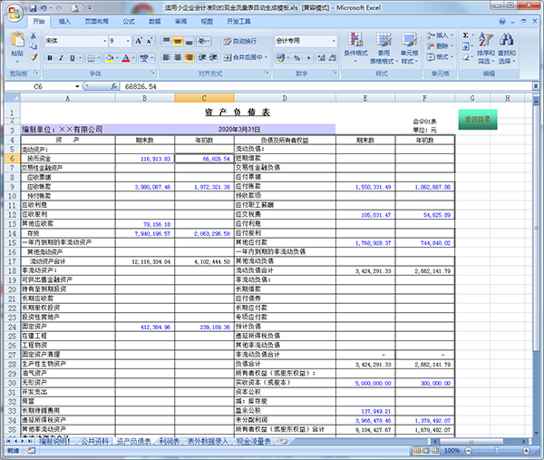这个模板包含五大表格:公共资料、资产负债表、利润及利润分配表、表外数据录入和现金流量表,以Excel形式呈现,支持字体和表格框的编辑,满足不同企业的需求。它的最大特色是弥补了资产负债表中信息量不足的问题,并能从现金流量角度对企业进行考核。