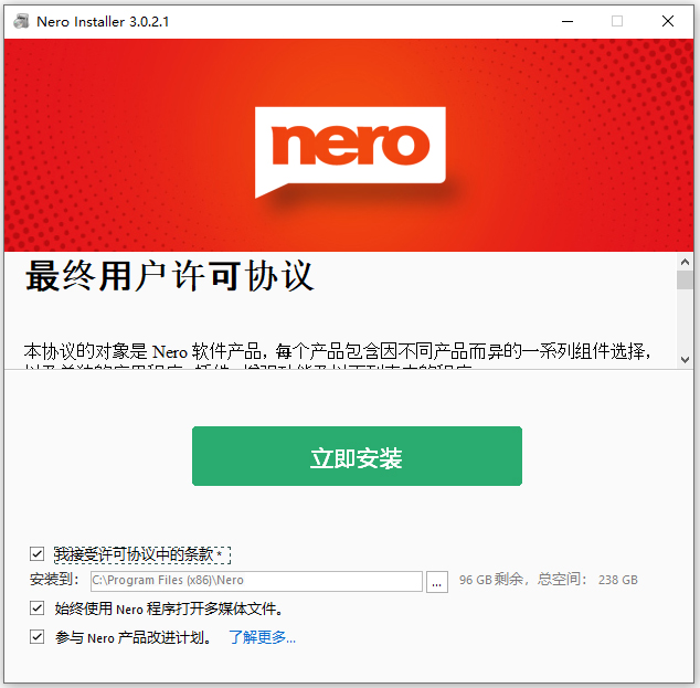 1、下载解压,得到nero platinum suite 2026中文版,接受条款安装;