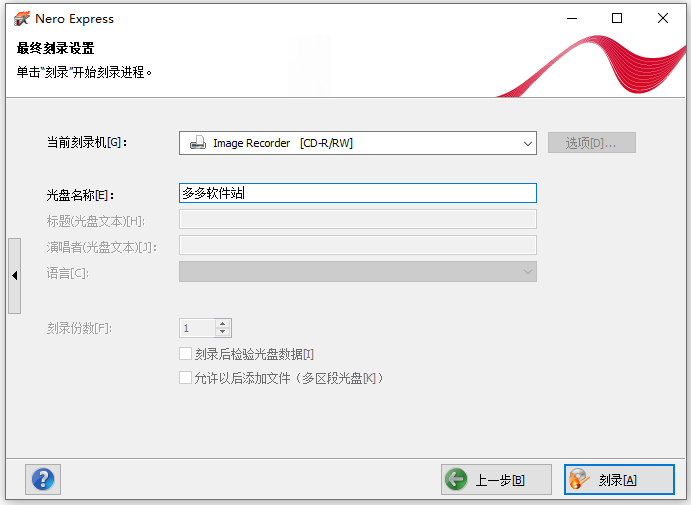 5、点击下一步后,选择你的刻录机,设置你的光盘名称,最后点击刻录按纽即可。