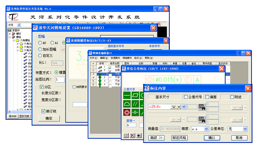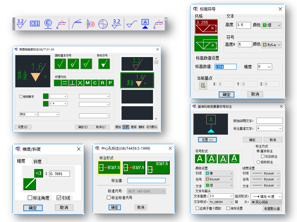 - 在符号标注方面提供了:粗糙度、形位公差、基准符号、焊接符号、锥斜度标注、中心孔标注、圆孔标记、标高符号等所有机械行业的符号标注功能。