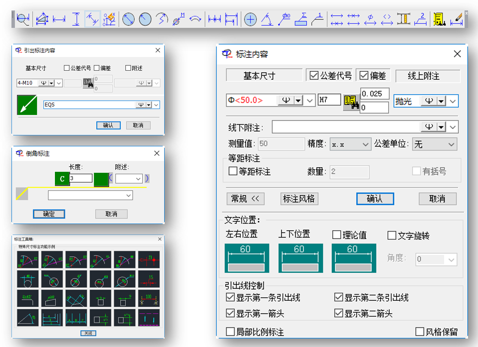 - 尺寸标注包括:智能标注、折弯标注、坐标标注、弧长标注、螺纹标注、倒角标注、引线标注、尺寸合并/分解、加直径符号、标注工具箱等多种分项标注功能。