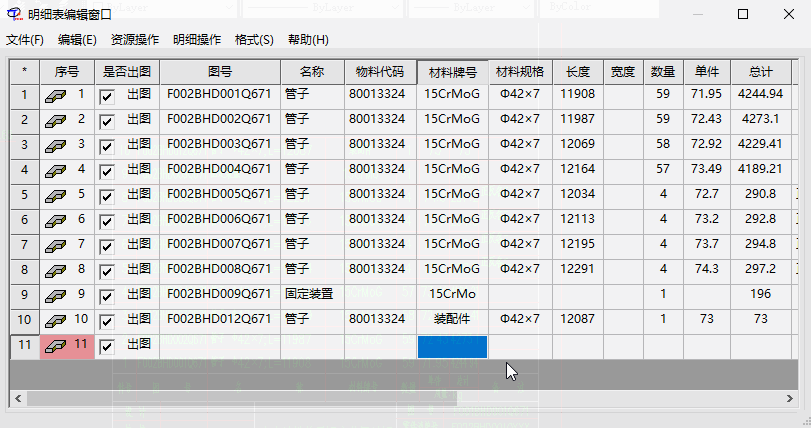 - 图纸标题栏和明细表的数据可以一起导出到excel模板中。
