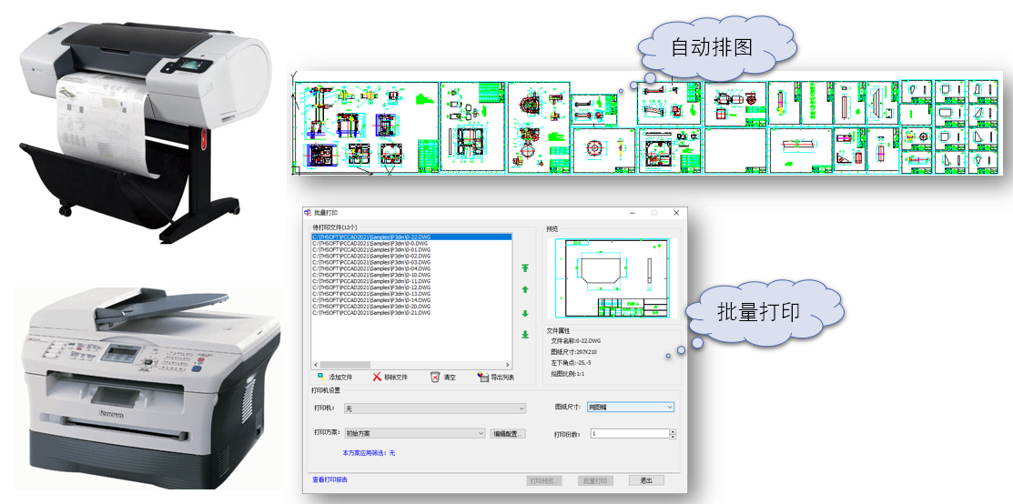 - 针对绘图仪,提供了“自动排图”功能。自动识别图纸比例,自动摆放图纸、自动旋转,成倍提高了大幅面绘图仪的效率及纸张利用率。