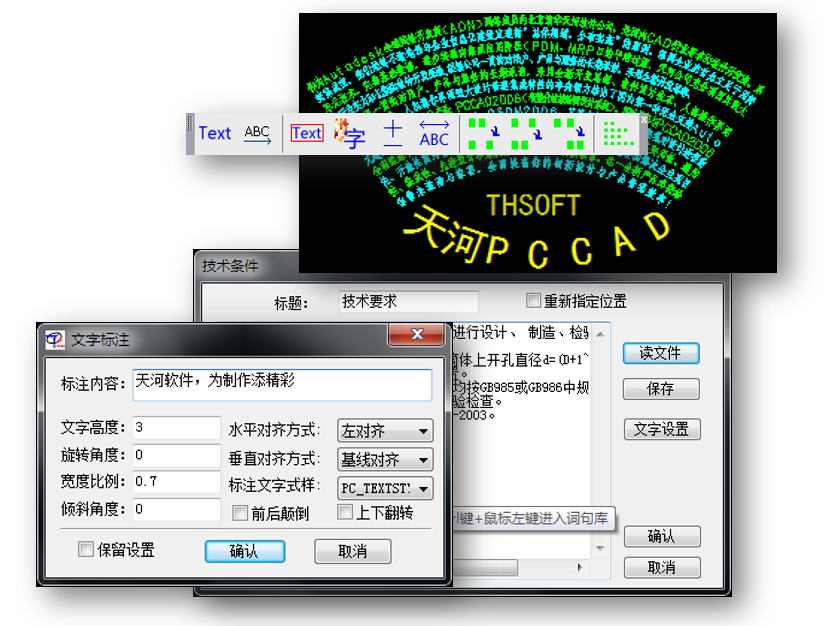 - 在文字处理方面,除了提供方便的文字标注、技术条件标注外,还提供了曲线文字、文字加框、文字炸开、数值增减、大小写转换、文字合并/分解、递增文字等等功能。