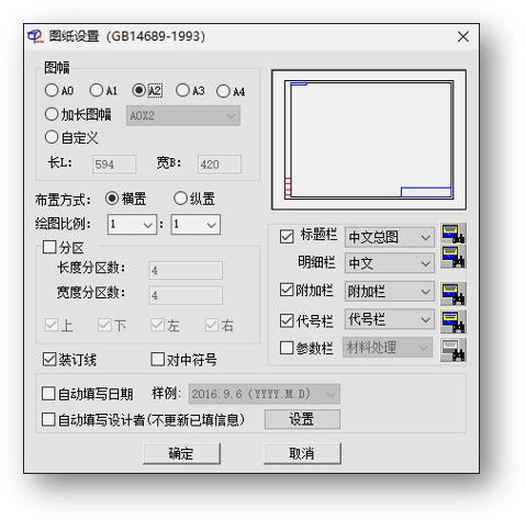 - 图纸设置命令,可快速创建带有标题栏、明细表、附加栏、参数栏的标准图框。