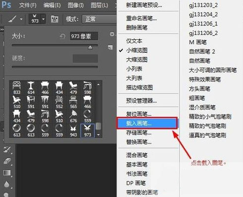 3、然后,从画笔的设置菜单中选择“载入画笔”,选择第1步解压的目录。